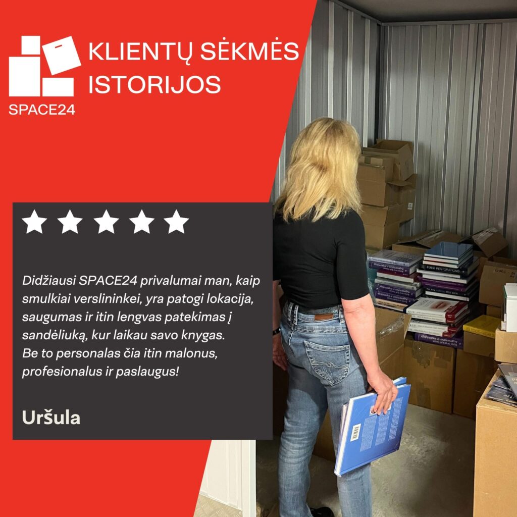 SPACE24 mini sandėliukai ypač tinka verslams, kurie prekiauja fizinėmis prekėmis ir reguliariai siunčia užsakymus. Turint sandėliavimo vietą miesto centre, prekes galima laikyti arčiau klientų ir kurjerių maršrutų, todėl siuntų išsiuntimo procesas tampa paprastesnis. Tokia vieta leidžia greičiau paruošti siuntas, efektyviau planuoti jų perdavimą kurjeriams ir patogiau valdyti kasdienį užsakymų srautą.
